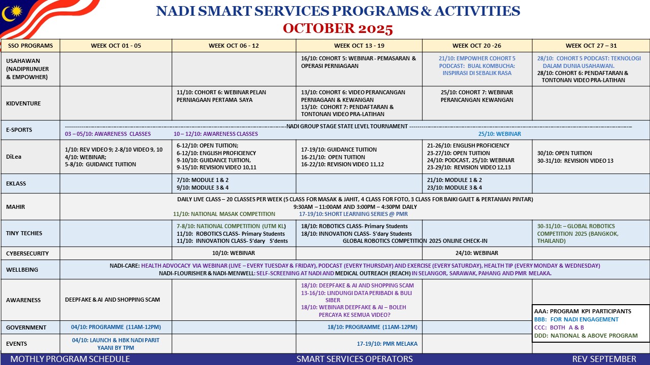 Tarikh: 02/10/2025 Masa: 10.00 – 11 pagi. Tempat: NADI Taman Tenteram Peserta: 3 orang Mahir Gadjet: KUIZ dan Asas Komputer. Tujuan: Tujuan program diadakan adalah untuk menguji pengetahuan peserta dan belajar asas komputer. Aktiviti: -Peserta diberi kuiz untk menguji kefahaman […]